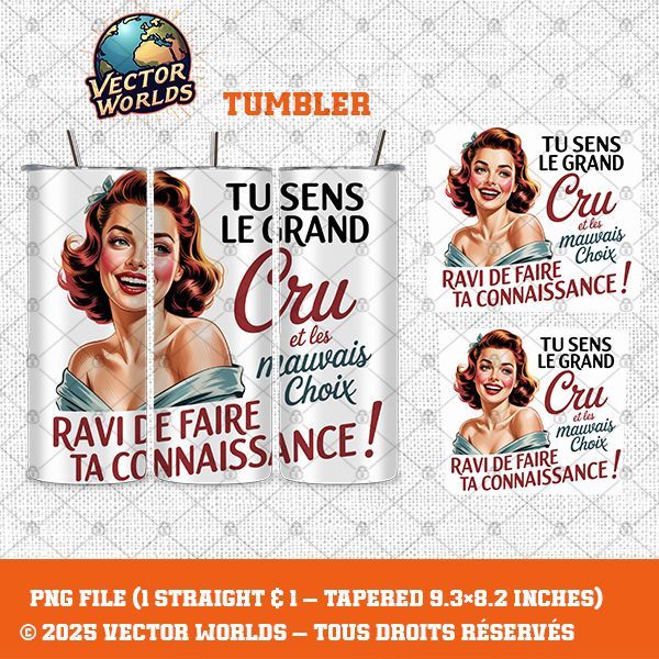 Vous recevrez 1 fichier PNG haute résolution (300 DPI) incluant les formats droit (straight) et conique (tapered), parfaits pour la sublimation sur tumbler.